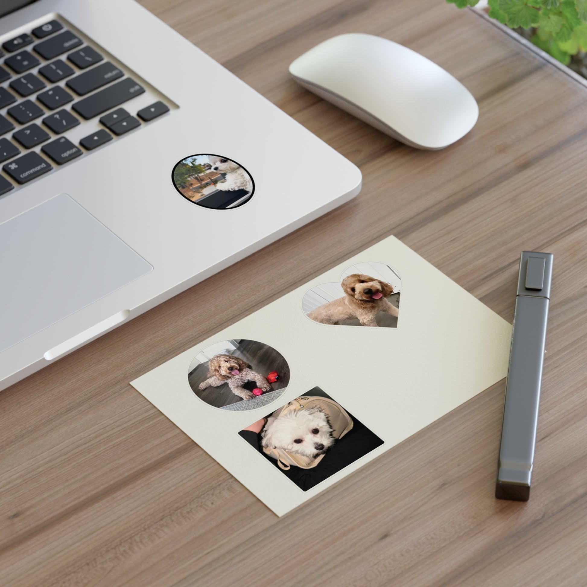 Personalize your belongings with these custom sticker sheets featuring 4 pictures of your dog in cute heart, circle, oval, and rectangle shapes. Perfect for dog lovers looking to add a touch of whimsy to their everyday items. Ideal for gifts on birthdays, holidays, or as a treat for yourself.